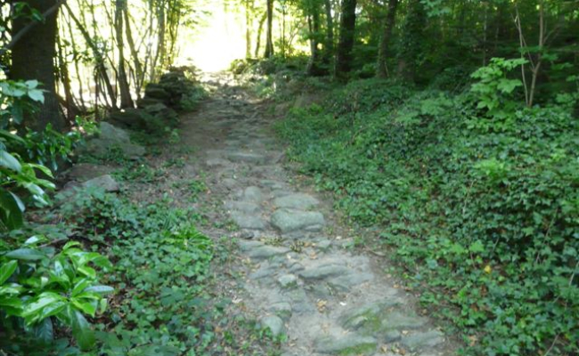 Lieu de passage des romains entre Jarez et Vallée du Rhône, le Col nous offre encore des chemins pavés par les romains. Ci dessous, chemin reliant le village à son Col, balisé jaune et blanc au départ de la place de l’église.